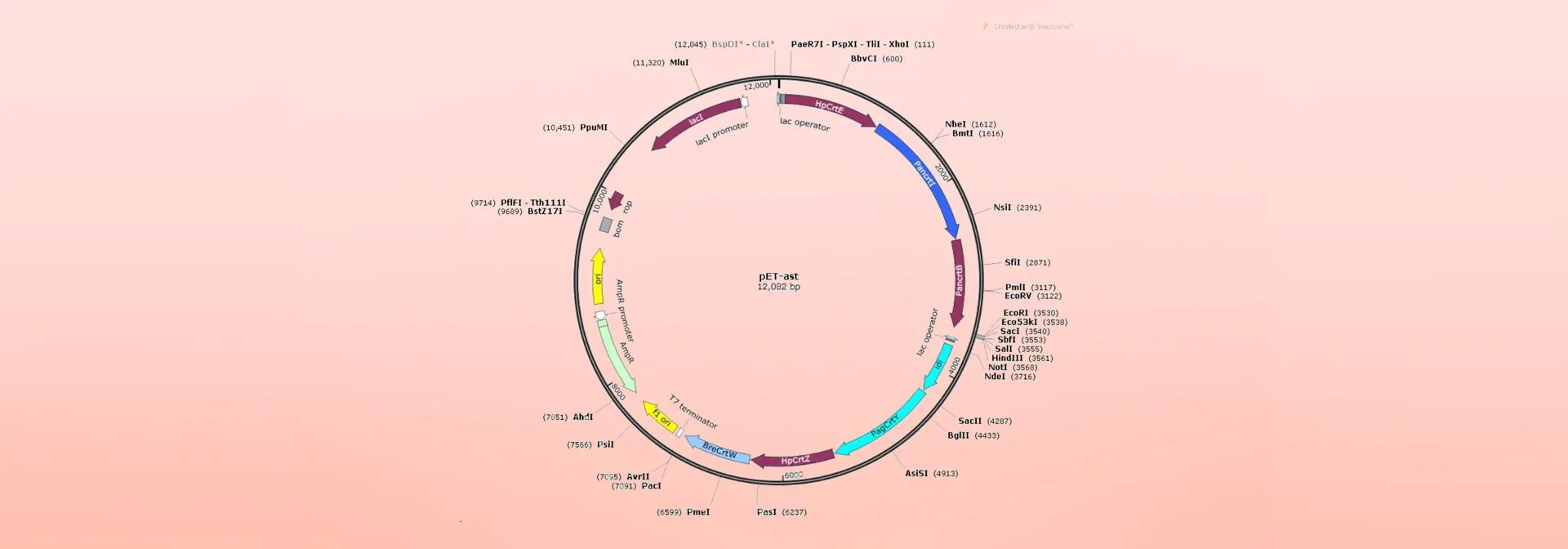 To achieve astaxanthin production in E. coli through enzymatic action, we established a cellular factory by engineering a plasmid and then introducing it into E. coli, thereby constructing the astaxanthin biosynthesis pathway within the bacteria. Biosynthesis of astaxanthin in E. coli requires seven genes: CrtE, CrtB, CrtI, CrtY, CrtZ, CrtW,and idi [2]. The T7 promoter offers extremely high transcription efficiency, driving abundant expression of the target proteins and boosting astaxanthin yield. Due to the large number of enzymes here, we employed a dual T7 promoter system (the expression plasmid pET-Duet-1, Figure 1), which helps reduce the accumulation of intermediate products. HpCrtE, PanCrtB, and PanCrtI were inserted into the multiple cloning site (MCS) of the first T7 promoter, and idi, PagCrtY, HpCrtZ, and BreCrtW were into the MCS of the second T7 promoter, thus to obtain the pET-ast plasmid (Figure 2).